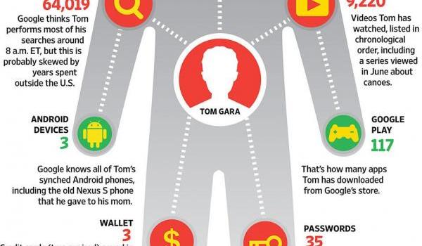 Here’s a snapshot of the kind of data we found on my Google Dashboard, put together as a graphic for today’s newspaper. It includes my 64,019 Google searches, and 134,966 Gmail conversations: