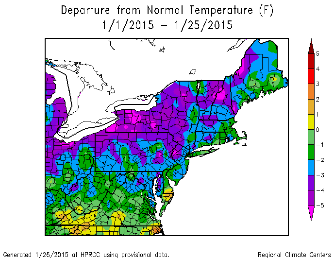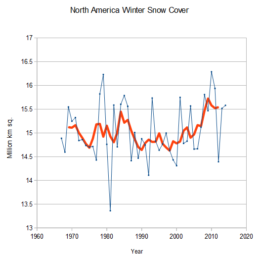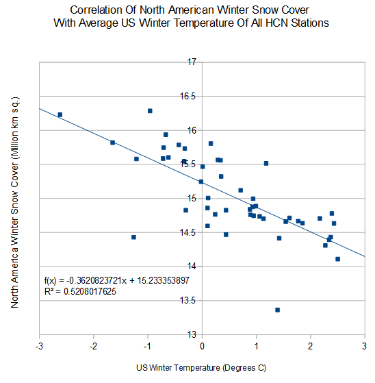 Not surprisingly, winter snow cover correlates well with winter temperature. During colder winters, the snow line moves further south. During warmer winters, the snow line moves further north.