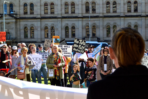 Protesters rallied at Queens Park in Brisbane yesterday to oppose proposals to revoke family tax benefits of conscientious objectors to vaccination, through means of legislative reform, and to promote the ideals of freedom of choice from state-enforced measures through lies, deception and propaganda.