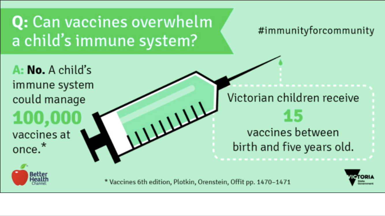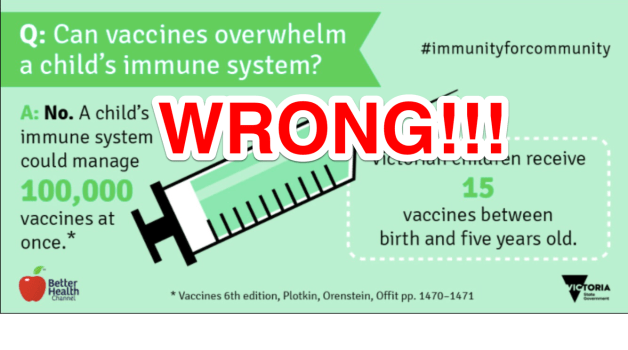 According to a new pamphlet by the Victorian Government it’s safe to inject 100,000 vaccines into a child…AT ONE TIME!