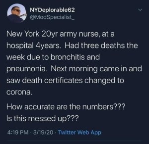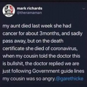 Add in the fact that writing on a deceased persons death certificate the cause of death being Coronavirus or COVID-19 without doing any testing to prove it just shows us how much of a scam this whole thing is.