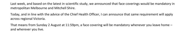 In a statement released today the Victorian government is now mandating that as of Sunday August 2, 11:59pm anyone leaving their home MUST have a face covering.