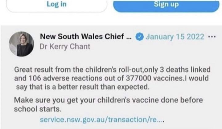New South Wales Chief Health Officer, Dr Kerry Chant, purportedly published a Tweet recently that was self aggrandizing and applauded her actions in the rollout of the COVID-19 vaccines for 5-11 year old children.